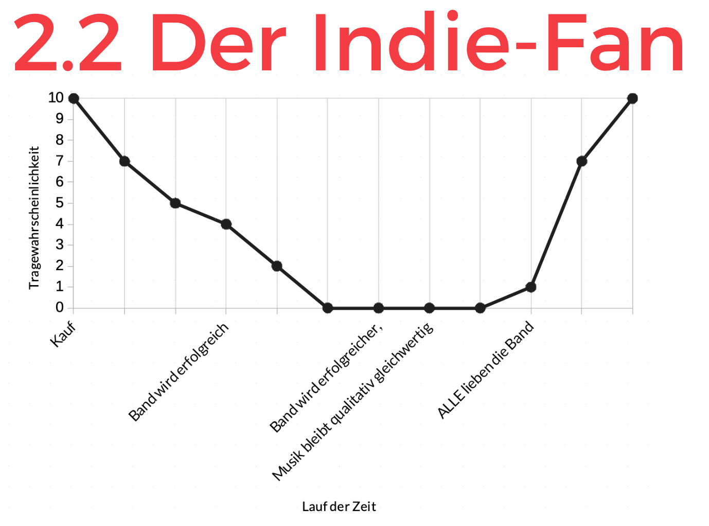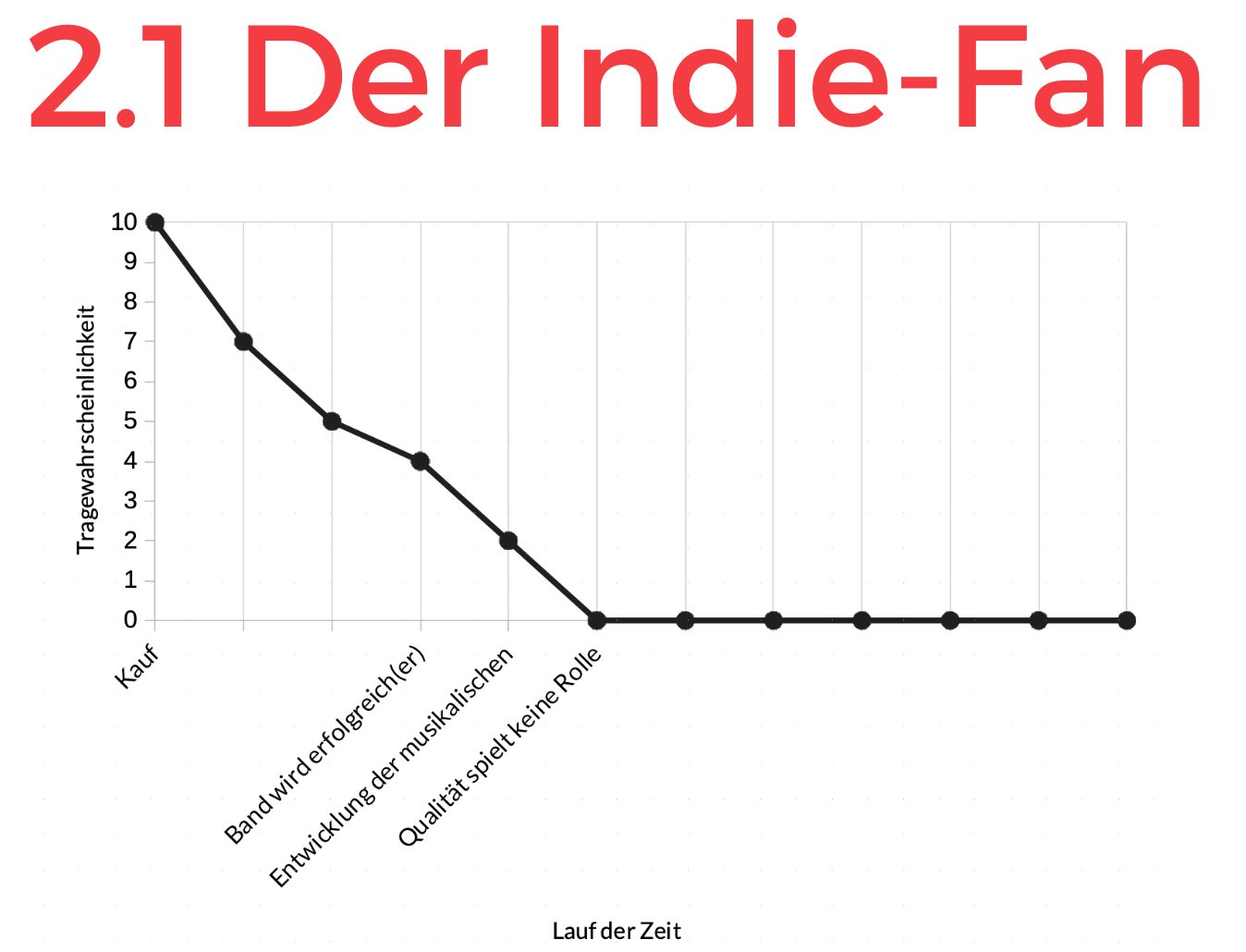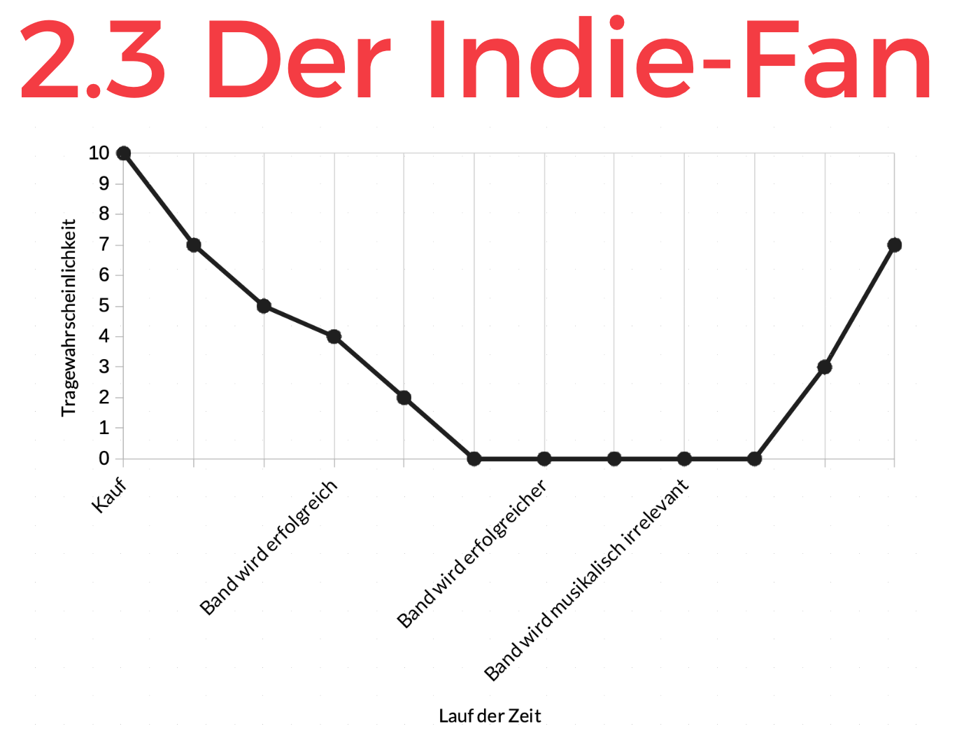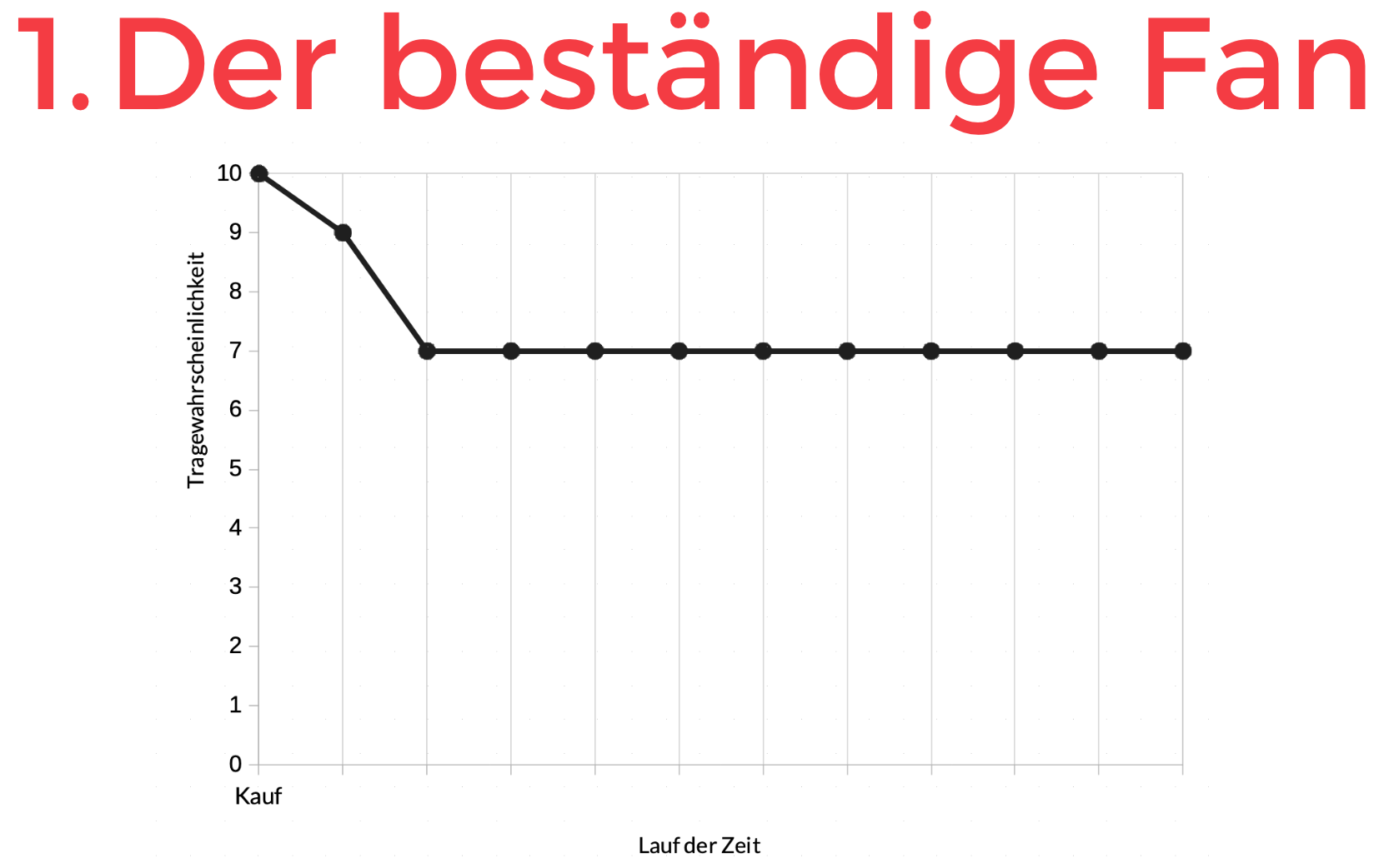 Kategorie 1: Der beständige Fan Diesem Fan ist der Bekanntheitsgrad seines Lieblingsartists egal. Sobald das T-Shirt gekauft wurde, wird es immer getragen, ungeachtet des sich verändernden Bekanntheitsstatus' der Band oder der Künstler*innen. Der Kauf passiert mit einer Anfangseuphorie von 10, die sinkt zwar leicht, bleibt aber konstant. Das Shirt wird zu seinem festen Bestandteil des Kleiderzyklus.